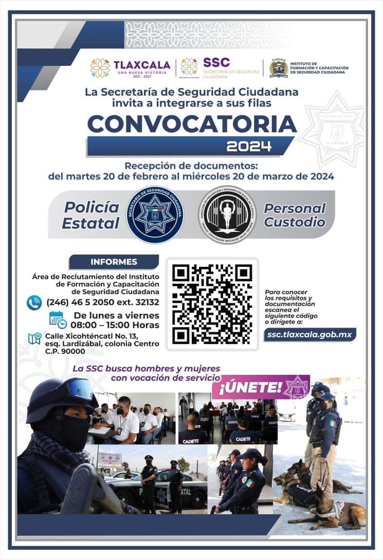 Tlaxcala 20 febrero 2024 (infortlax) Con el objetivo de formar más y mejores policías que garanticen la protección y seguridad de la población tlaxcalteca, la Secretaría de Seguridad Ciudadana (SSC) invita a mujeres y hombres interesados a participar en el proceso de selección e ingreso a la Policía Estatal y Personal Custodio, para desarrollarse en el ámbito policial con responsabilidad, disciplina y dedicación.